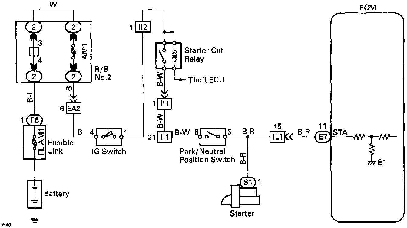 When the engine is cranked, the intake air flow is slow, so fuel vaporization is poor. A rich mixture is therefore necessary in order to achieve good startability. While the engine is being cranked, the battery positive voltage is applied to terminal STA of the ECM. The starter signal is mainly used to increase the fuel injection volume for the starting injection control and after-start injection control.