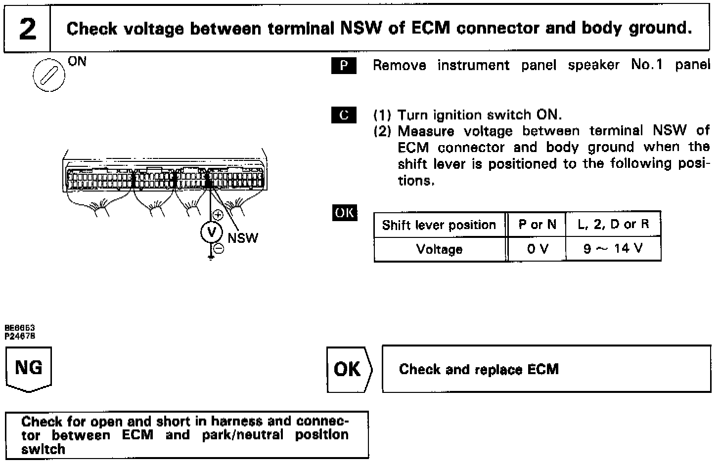 The park/neutral position switch goes on when the shift lever is in the N or P shift position. When it goes on terminal NSW of the ECM is grounded to body ground via the starter relay, thus the terminal NSW voltage becomes 0 V. When the shift lever is in the D, 2, L or R position, the park/neutral position switch goes off, so the voltage of ECM, terminal NSW becomes battery voltage, the voltage of the ECM internal power source. If the shift lever is moved from the N position to the D position, this signal is used for air-fuel ratio correction and for idle speed control (estimated control), etc.