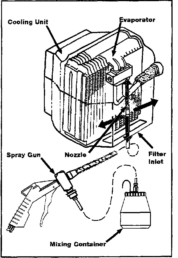 b. Insert spray nozzle into the filter inlet and spray the entire quantity (1 qt.) of freshener solution into the evaporator while moving the nozzle around to cover the complete evaporator surface.