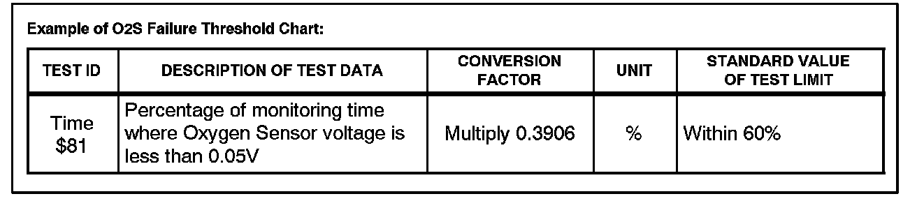 3. Compare O2S test results with the specified O2S Failure Threshold Chart. It may be necessary to convert O2S test results to a specific measurement unit using the conversion factor that is supplied in the specified table. See example.