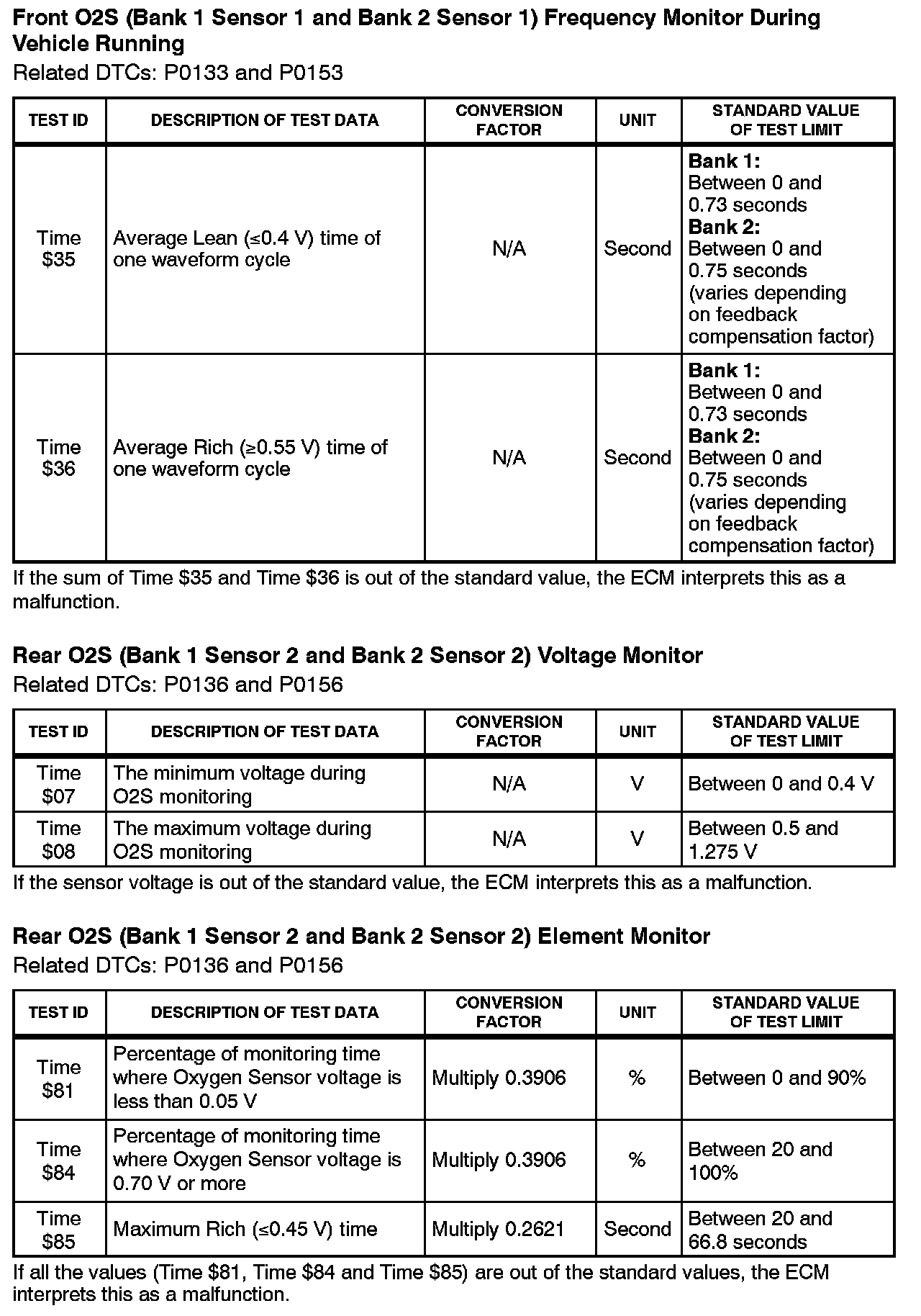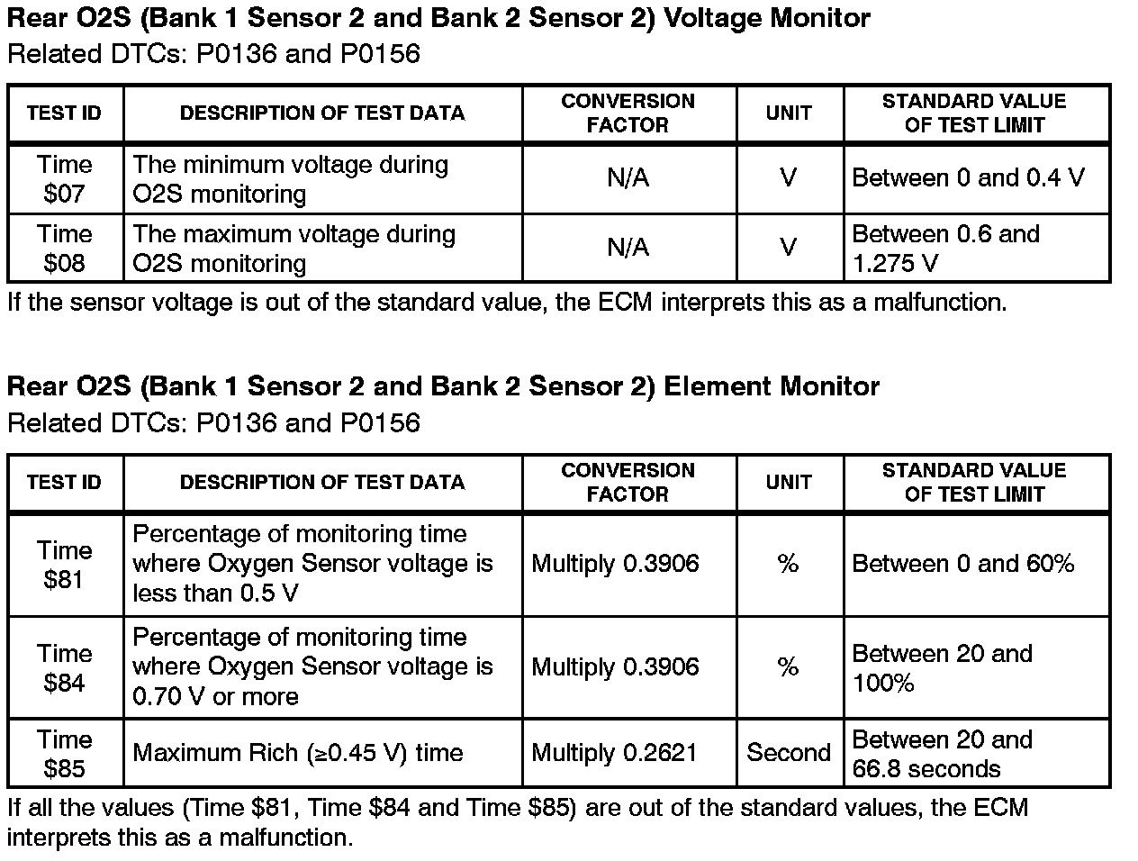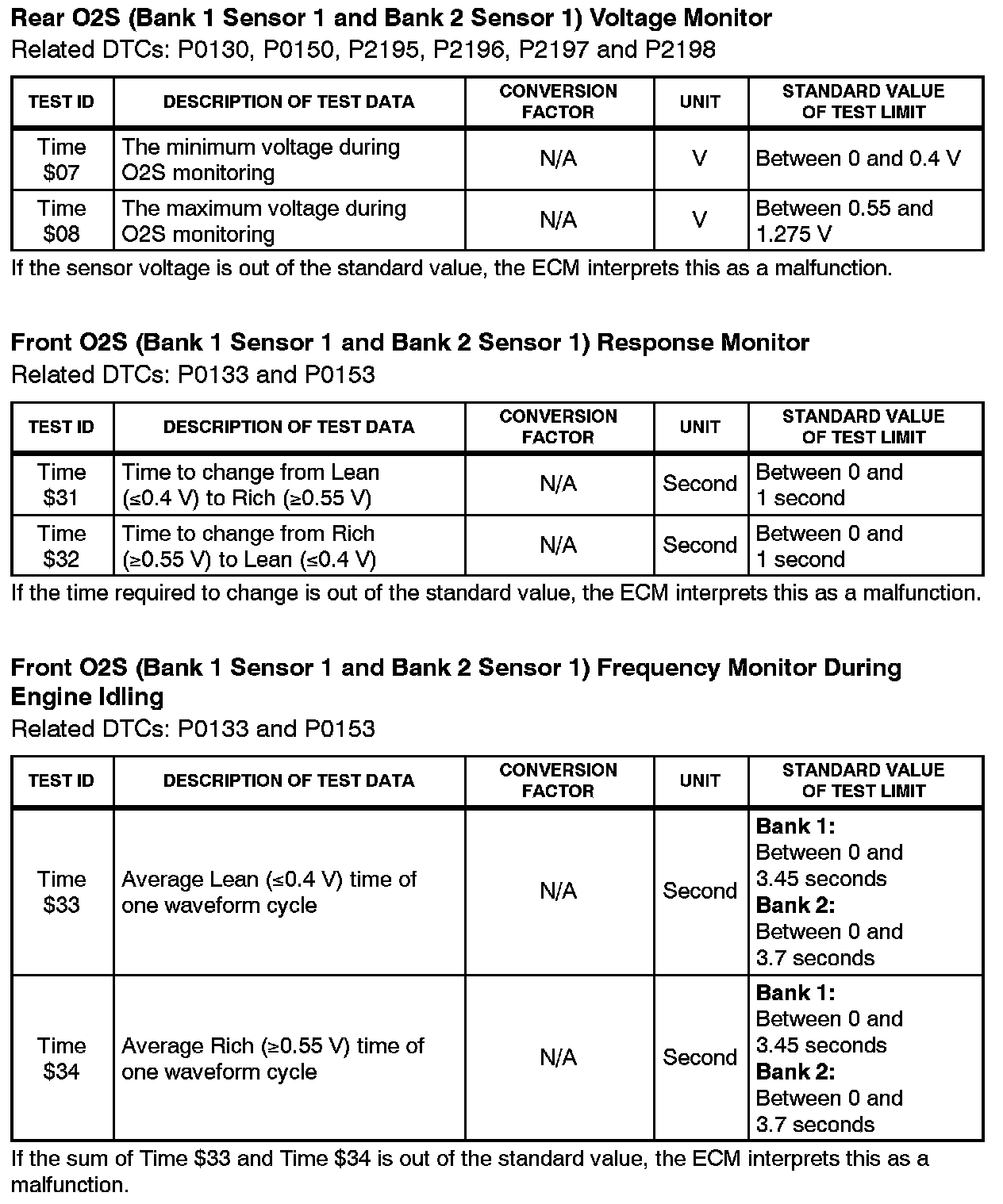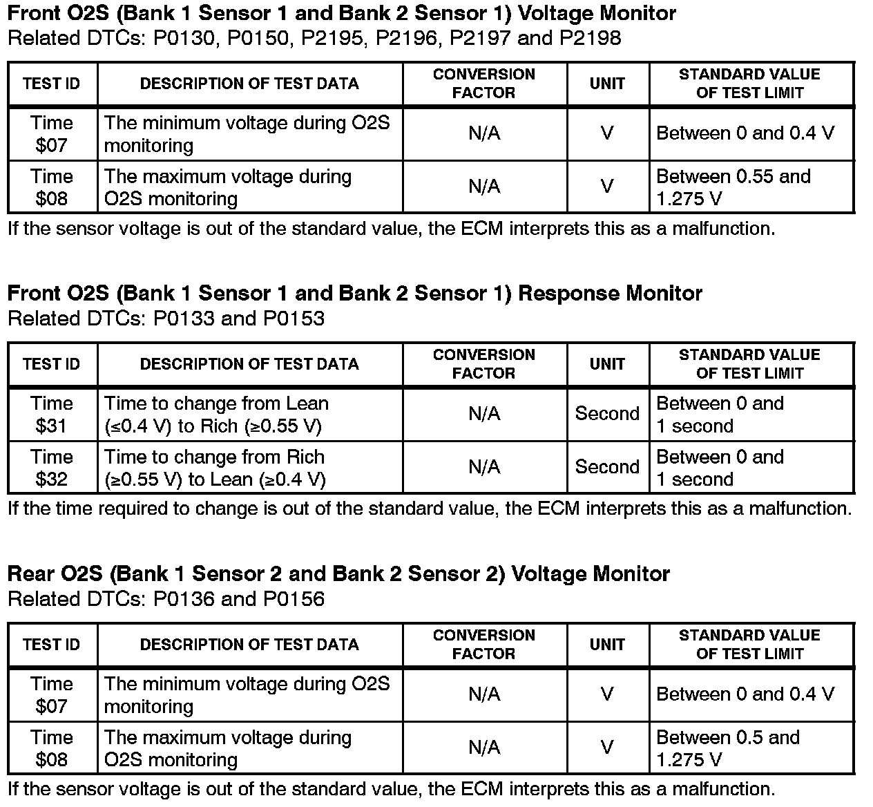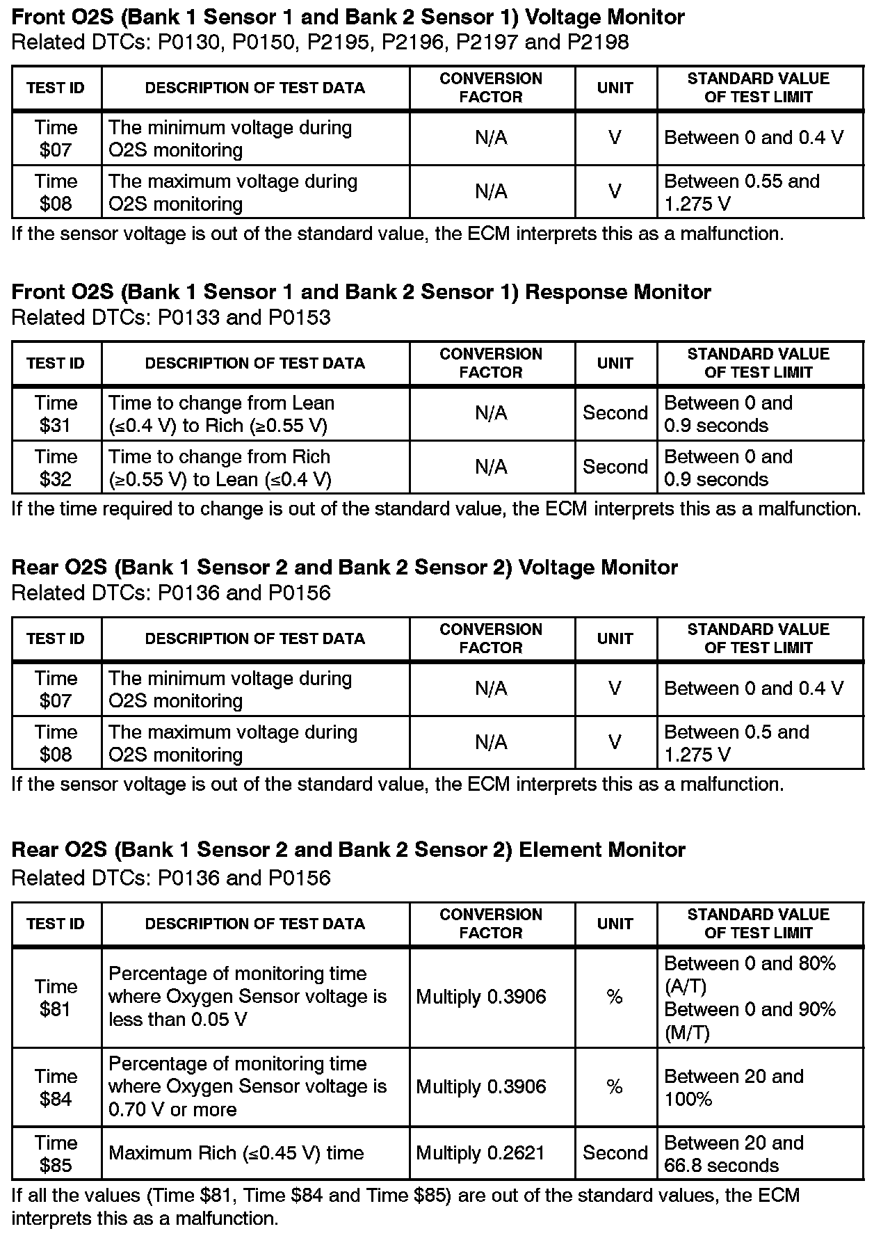 This Service Bulletin contains Oxygen Sensor (O2S) Monitor threshold values for all models from 1996 to 2003 and some 2004 models. Starting in 2004, the O2S Monitor threshold values can be found in the repair manual. These values are used when analyzing the 02S test results to determine the O2S condition.