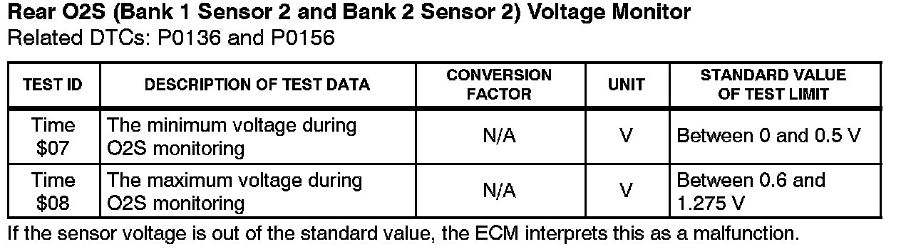 Before the O2S Monitor completes or after the ignition switch is turned OFF, the Diagnostic Tester displays the viewable upper limit or a lower limit of the test value (example: 0 V, 1.275 V, os [seconds], 10.2s, 0 and 255).