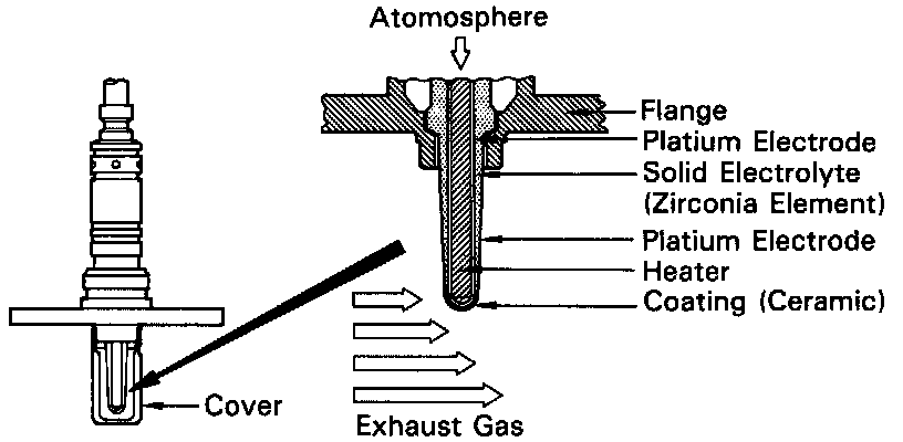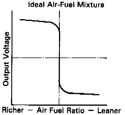 The oxygen sensor has the characteristic whereby its output voltage changes suddenly in the vicinity of the stoichiometric air-fuel ratio. This characteristic is used to detect the oxygen concentration in the exhaust gas and provide feedback to the computer for control of the air-fuel ratio.
