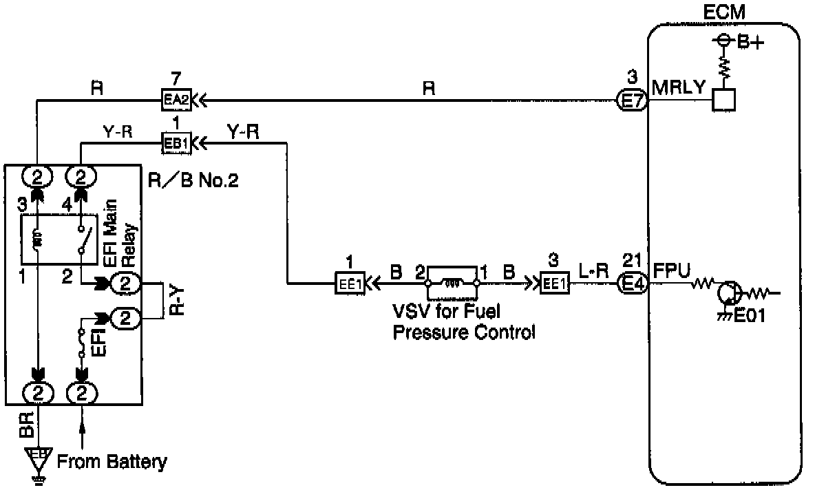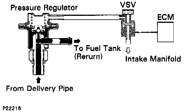 The ECM turns on a VSV (Vacuum Switching Valve) to draw the air into the diaphragm chamber of the pressure regulator if it detects that the temperature of the engine coolant is too high during engine starting.