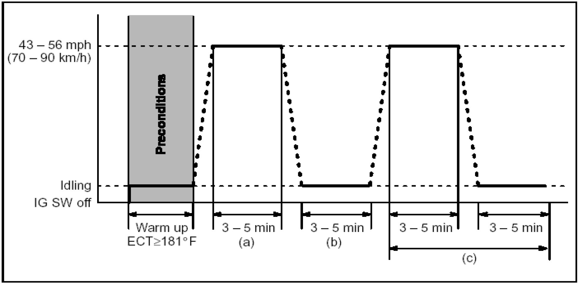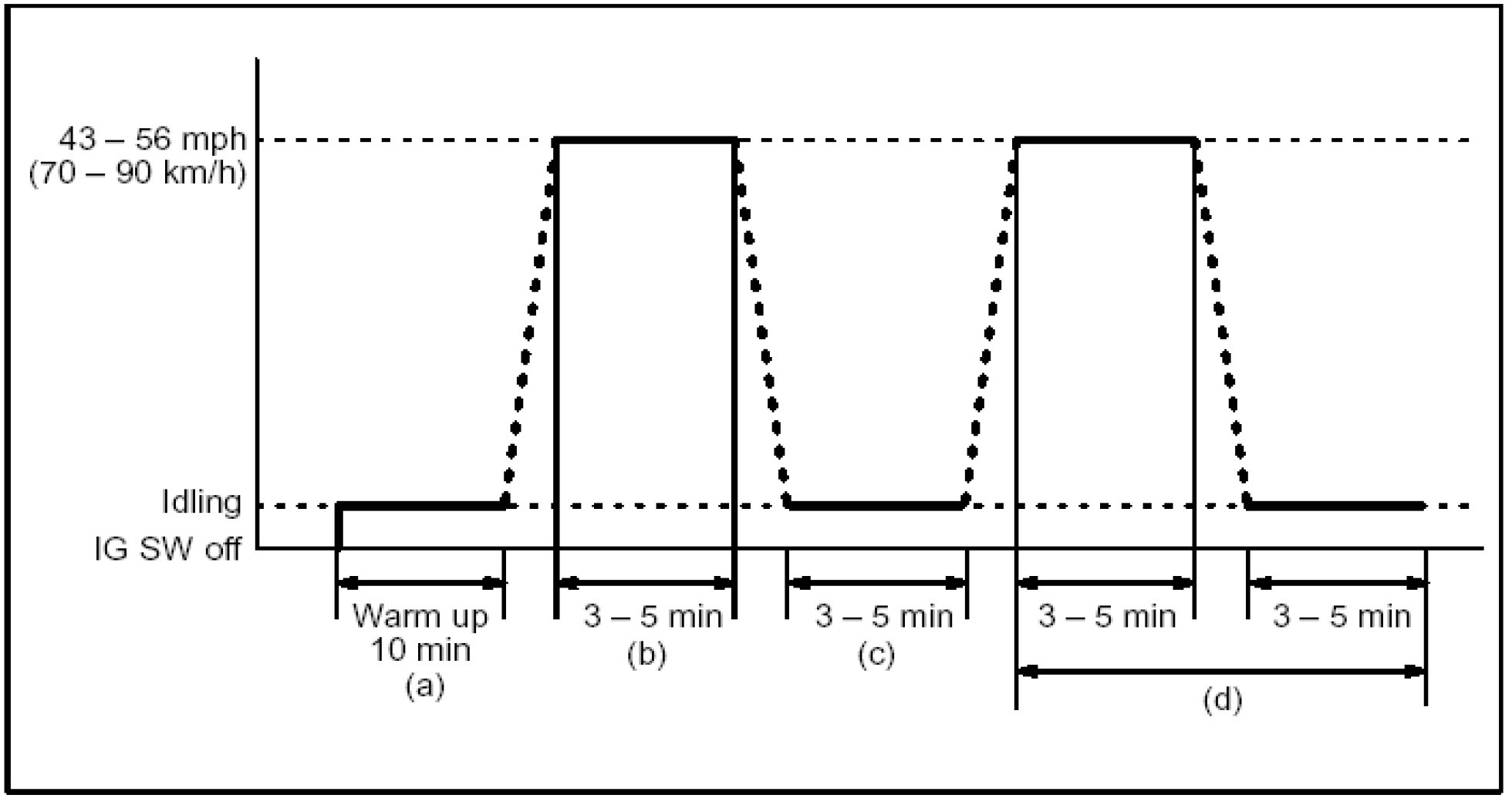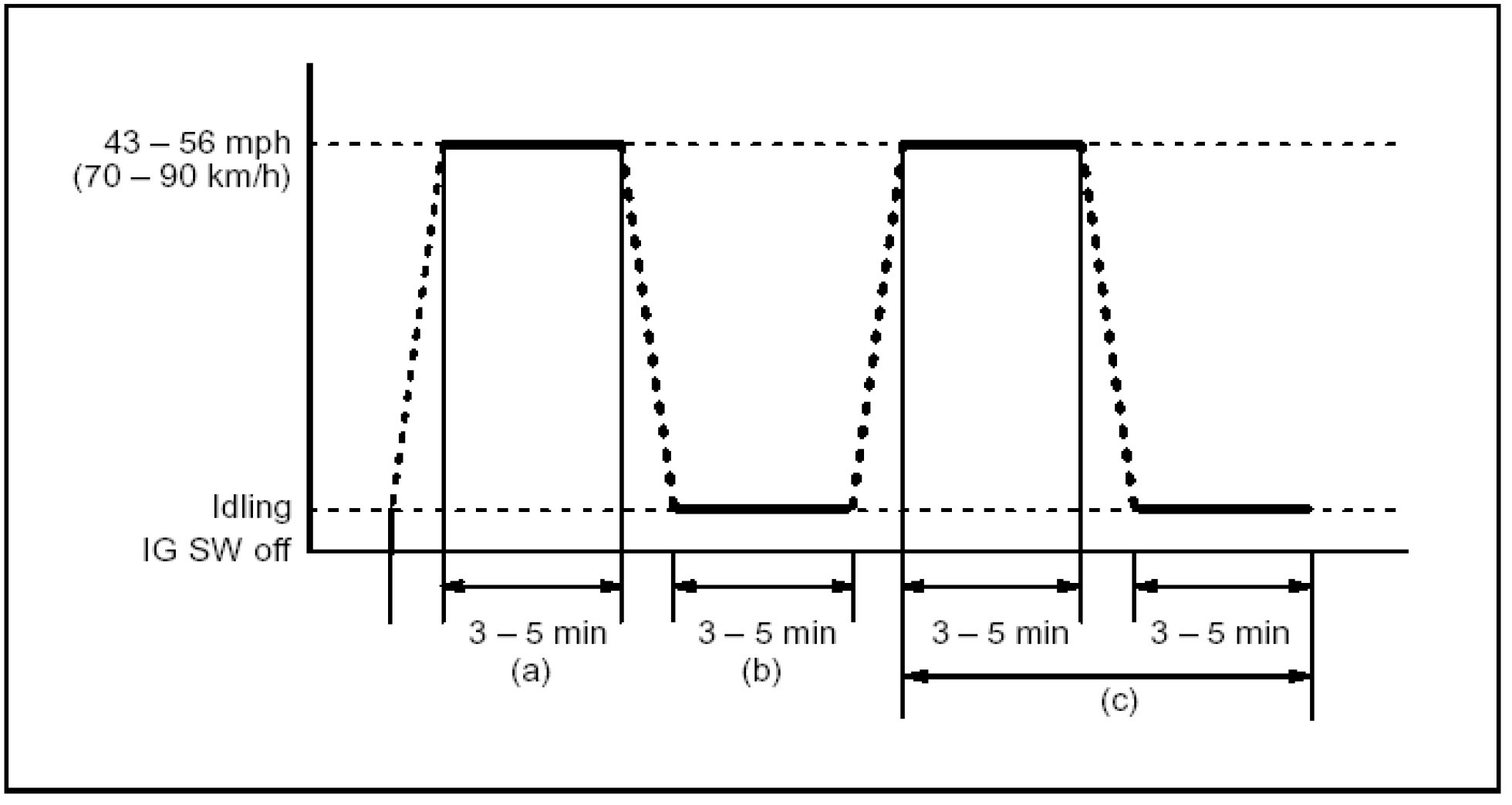 b) Drive the vehicle at 43 - 56 mph (70 - 90 km/h) for a period of 3 - 5 minutes.