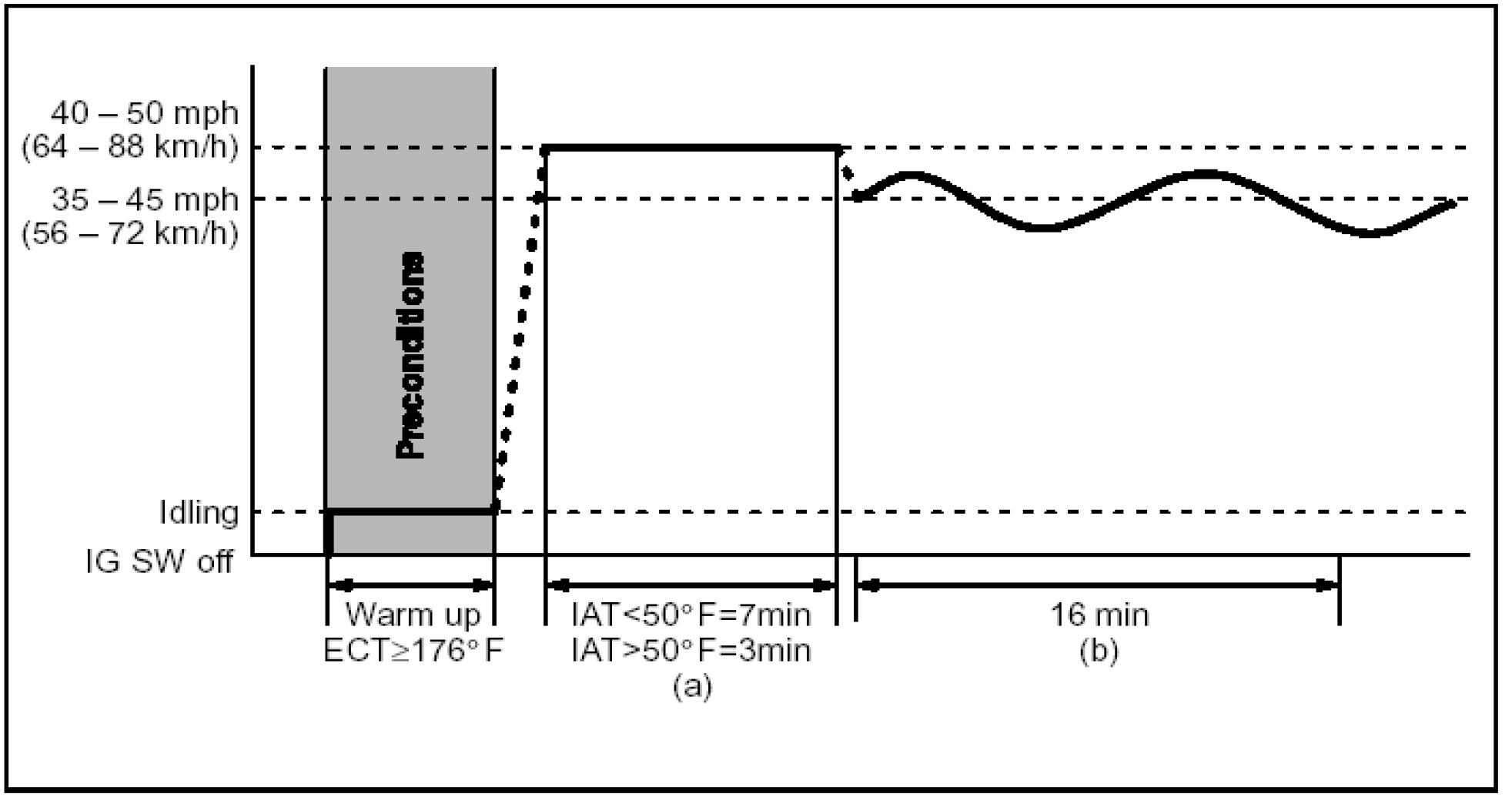 b) Drive the vehicle at 35 - 45 mph (56 - 72 km/h) for about 16 minutes.