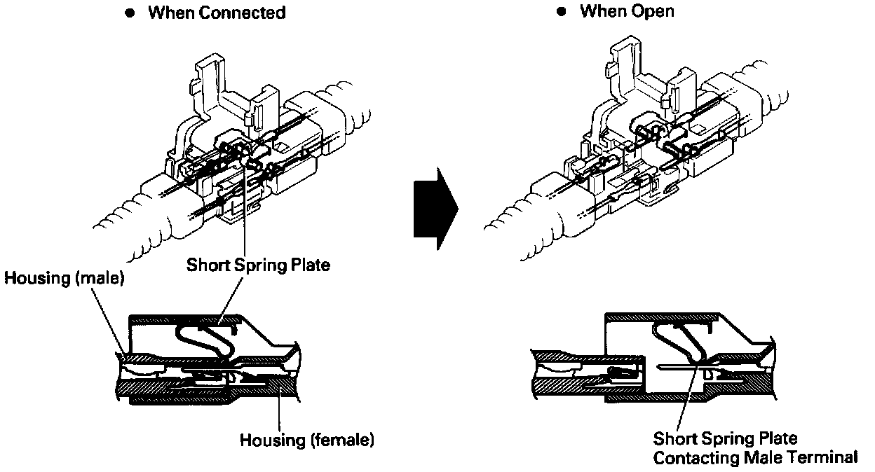 Each connector contains a short spring plate. When the connector is disconnected, the short spring plate automatically connects the power source and grounding terminals of the squib to preclude a potential difference between the terminals.