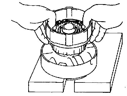b. Being careful not to damage the O-rings, press the clutch piston into the forward clutch drum with both hands.