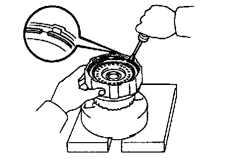 c. Install the snap ring with a screwdriver. Be sure the end gap of the snap ring is not aligned with the cutout portion of the forward clutch drum.