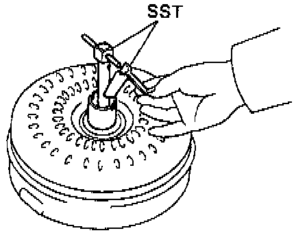 b. Install SST 09350-30020 (09351-32020) or equivalents, so that it fits in the converter hub not and outer race of the one-way clutch.