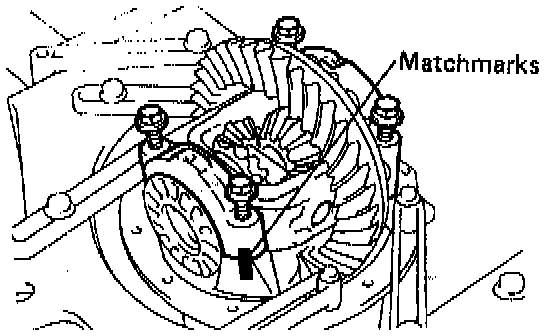 15. Install bearing caps. Align the matchmarks on the cap and carrier. Screw in the 2 bearing cap bolts 2 or 3 turns and press down the bearing cap by hand. Reinstall the adjusting nuts if necessary.
