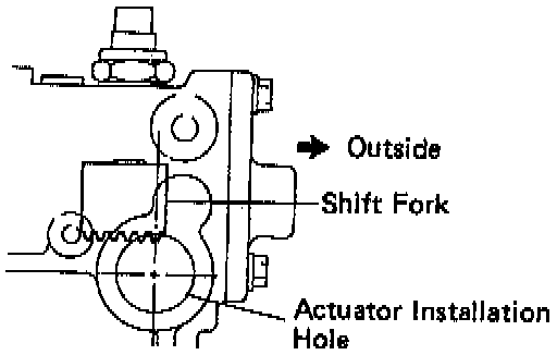 a. Check that the outermost rack tooth of the shift fork is virtually above the center line of the actuator installation hole.