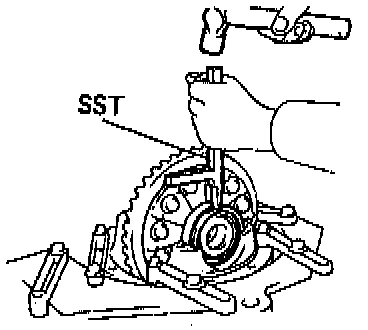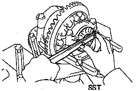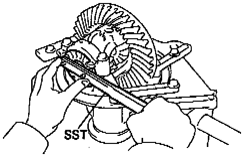 d. With turning the ring gear, use the SST to fully tighten the adjusting nut on the drive pinion side. after the bearings as settled, loosen the adjusting nut on the drive pinion side.