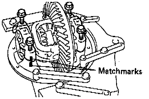14. w/o Differential lock: Install bearing caps. Align the matchmarks on the cap and carrier. Screw in the 2 bearing cap bolts 2 or 3 turns and press down the bearing cap by hand. Reinstall the adjusting nuts if necessary.
