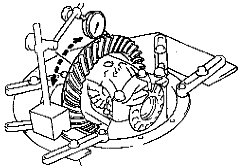 b. Turn the companion flange, pin both directions to inspect the ring gear for proper tooth contact. If the teeth are not contacting properly, use the to select a proper washer for correction.