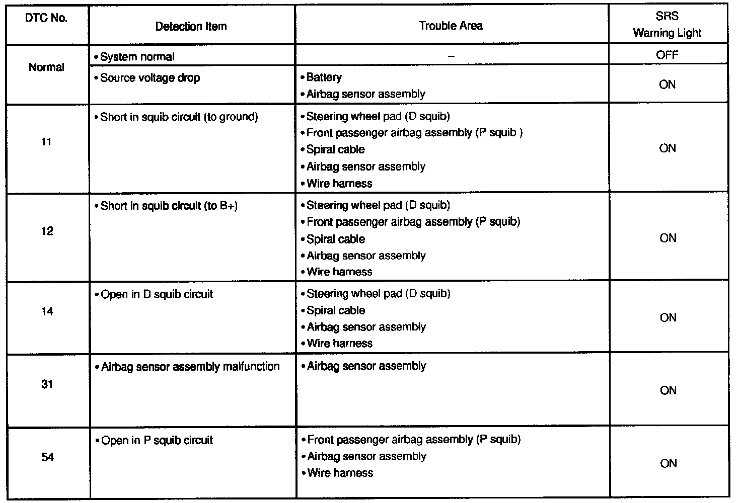 ^ If a code not listed on the chart is displayed, the airbag sensor assembly is faulty.