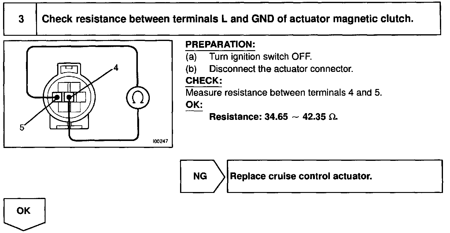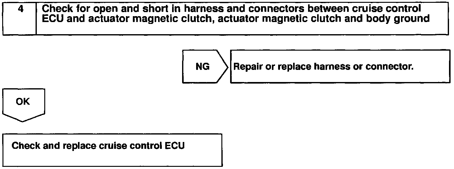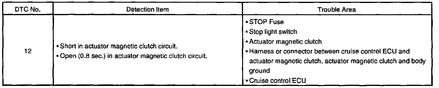 CIRCUIT DESCRIPTIONThis circuit turns on the magnetic clutch inside the actuator during cruise control operation according to the signal from the ECU. If a malfunction occurs in the actuator or speed sensor, etc. during cruise control operation, the rotor shaft between the motor and control plate is released.