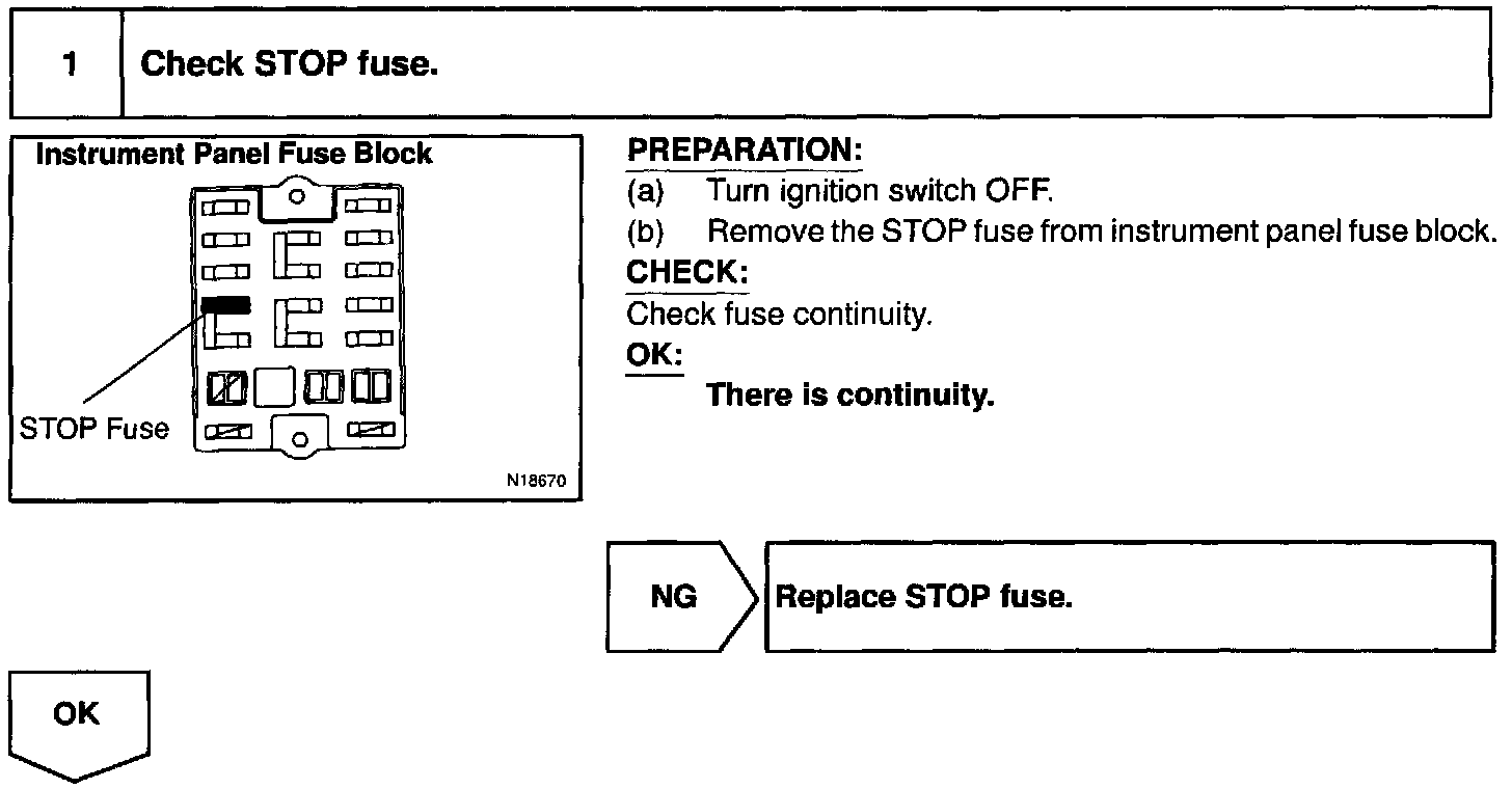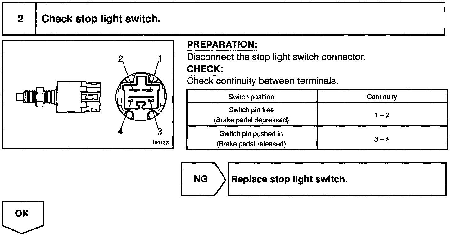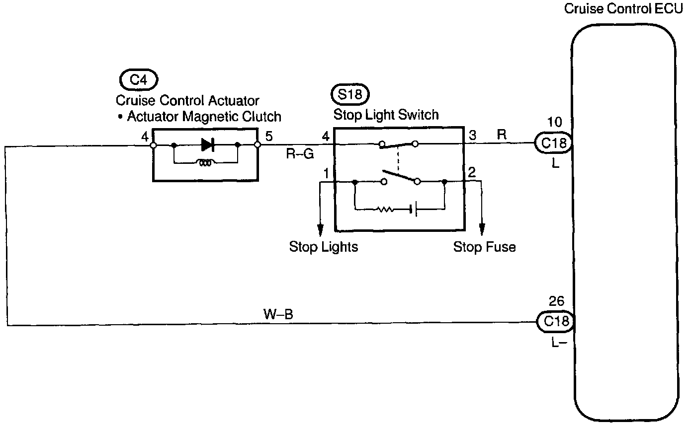 When the brake pedal is depressed, the stop light switch turns on, supplying electrical power to the stop light. Power supply to the magnetic clutch is mechanically cut and the magnetic clutch is turned OFF.