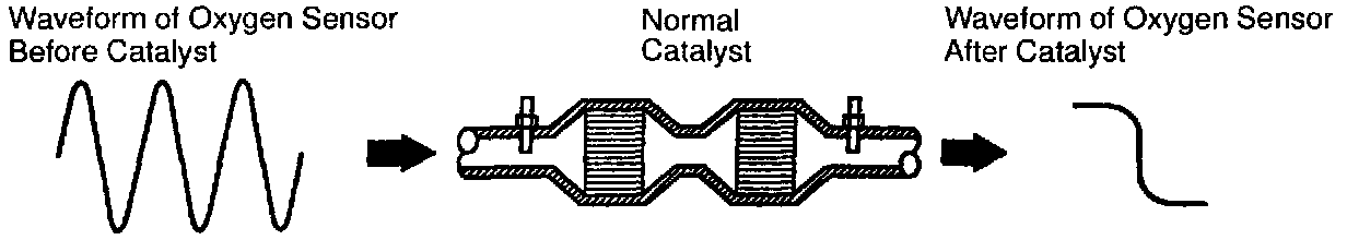 If the catalyst is functioning normally, the waveform of the oxygen sensor after the catalyst switches back and forth between rich and lean much more slowly than the waveform of the oxygen sensor before the catalyst.