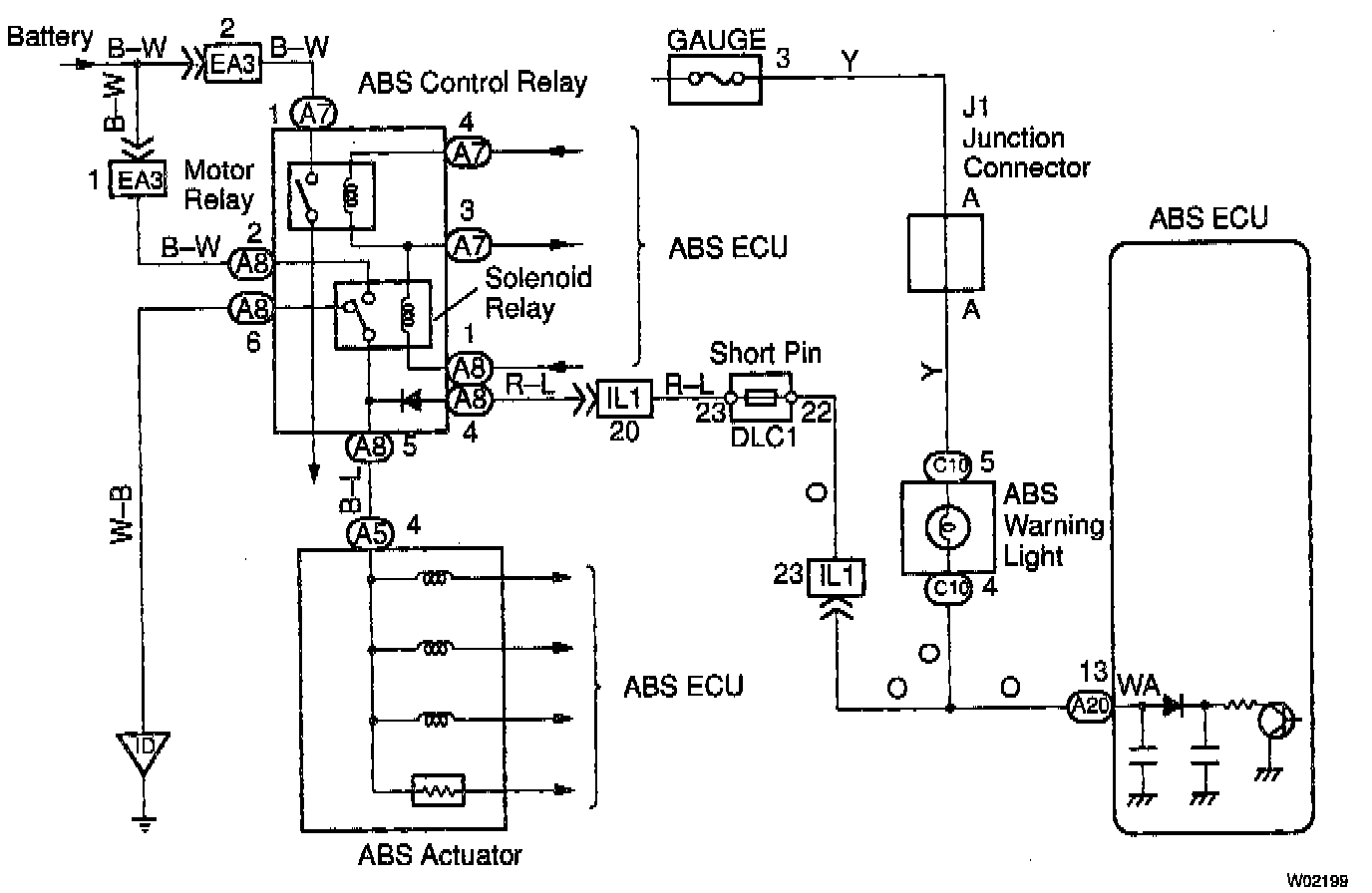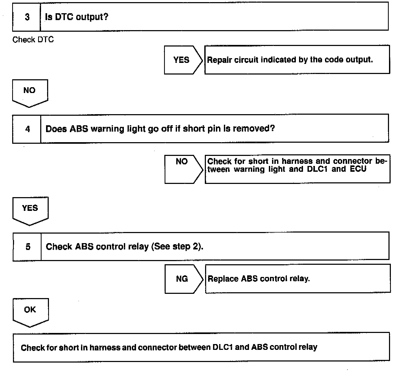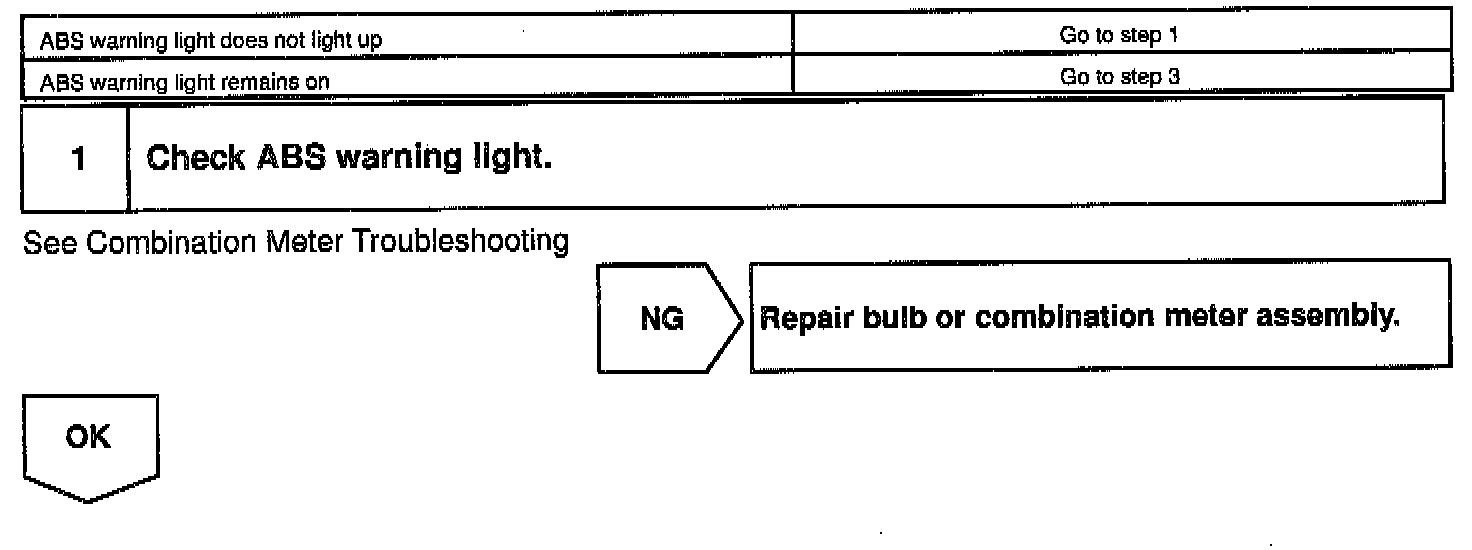 If the Electronic Control Unit (ECU) detects trouble, it lights the Anti-Lock Brake System (ABS) Warning Light while at the same time prohibiting ABS control. At this time, the ECU records a Diagnostic Trouble Code (DTC) in memory.