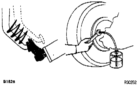 (b) While an assistant depresses the pedal, loosen the bleeder plug until fluid starts to run out. Then tighten the bleeder plug.
