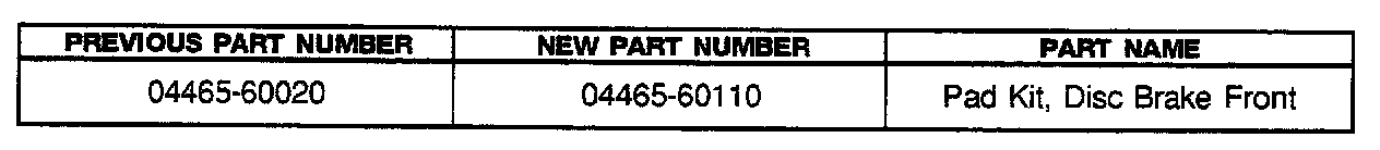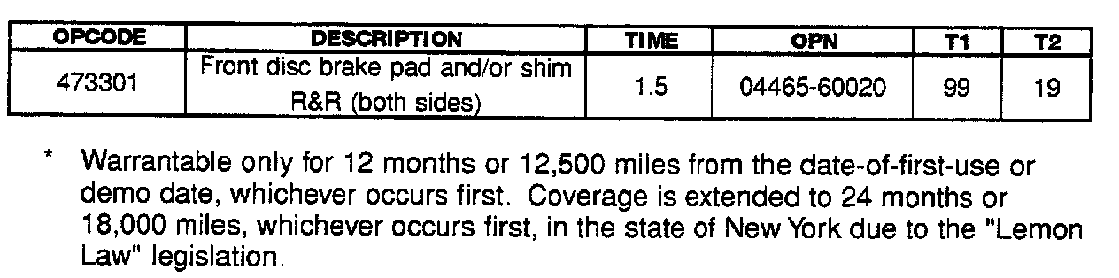 NOTE: Replacement of the front brake pad (pad only) kit under warranty is limited to correction of a problem based upon a customers complaint and subject to all of the provisions of LEXUS Warranty Policy Bulletin POL94-17, dated October 10,1994.