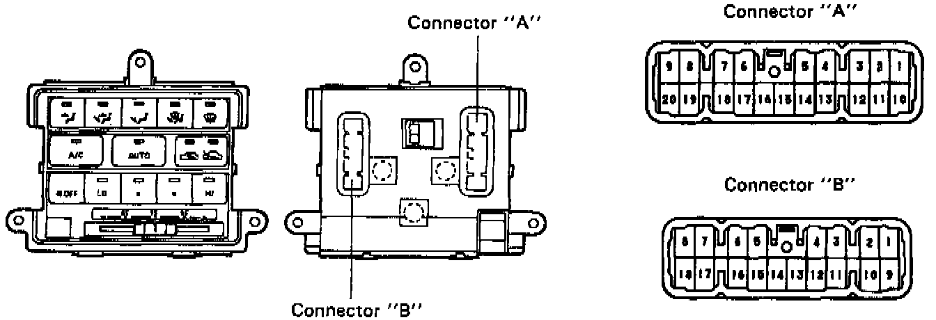 d. Connect the positive (+) lead from the battery to terminal 131 through a 1.4 W test bulb and then check that the indicator and test bulb light up, while switch is pressed. If operation is not as specified, replace the A/C control assembly.