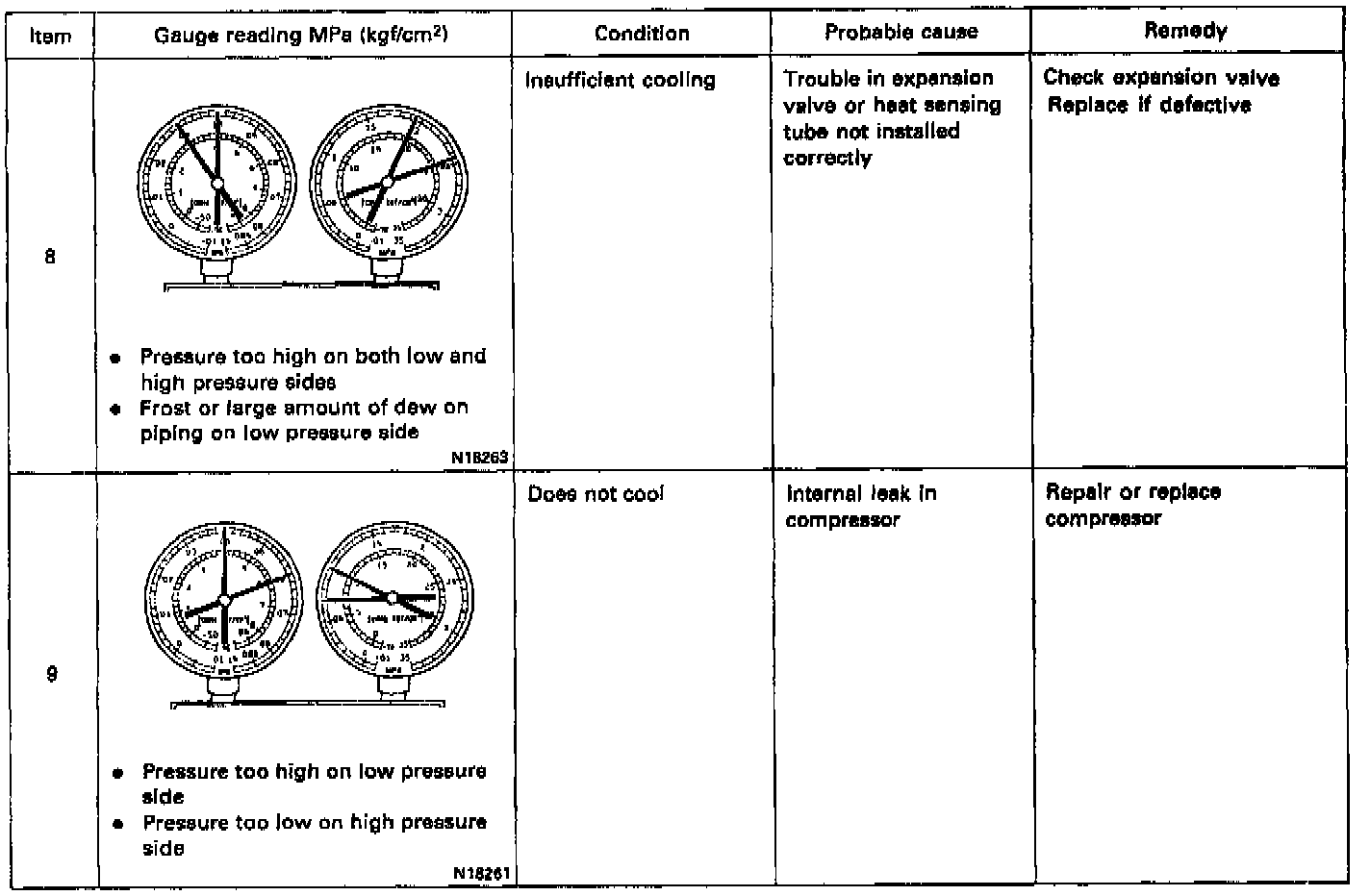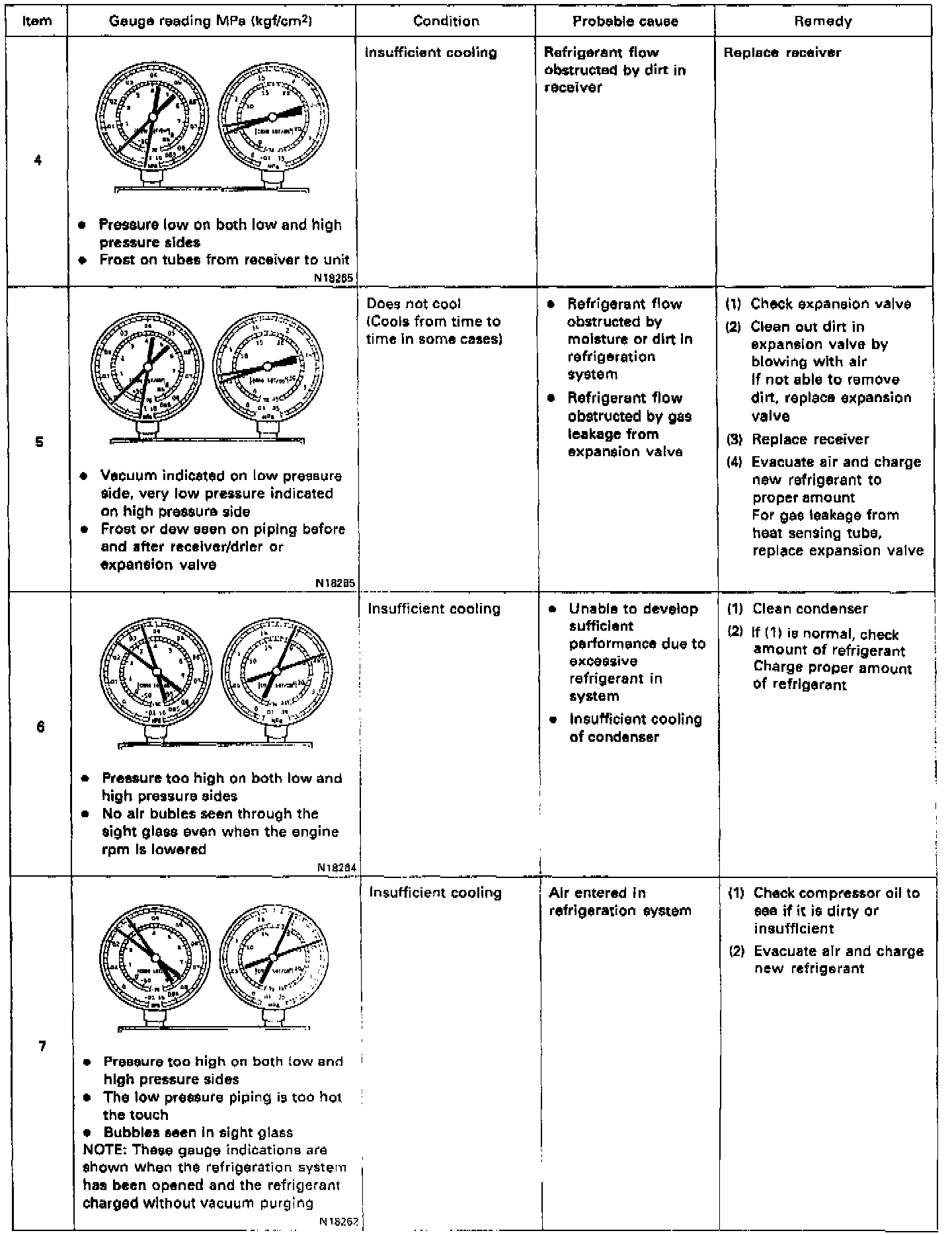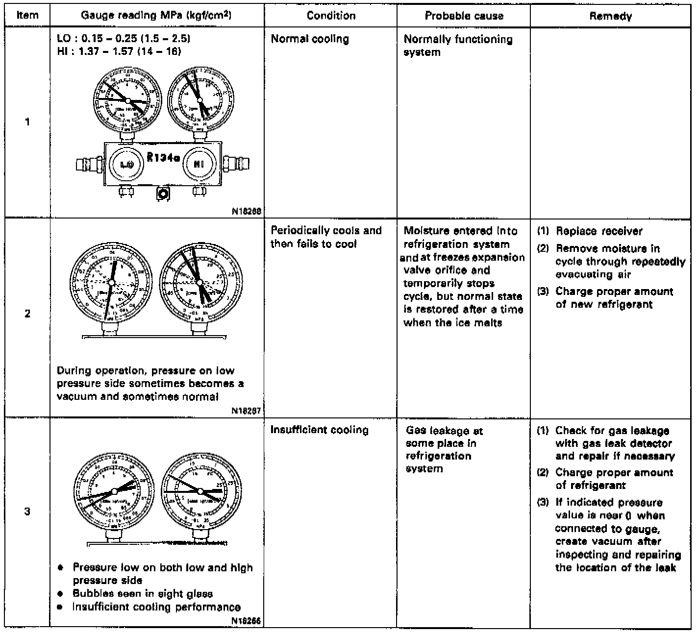 This is a method in which the trouble is located by using a manifold gauge set. Read the manifold gauge pressure when the these conditions are established: