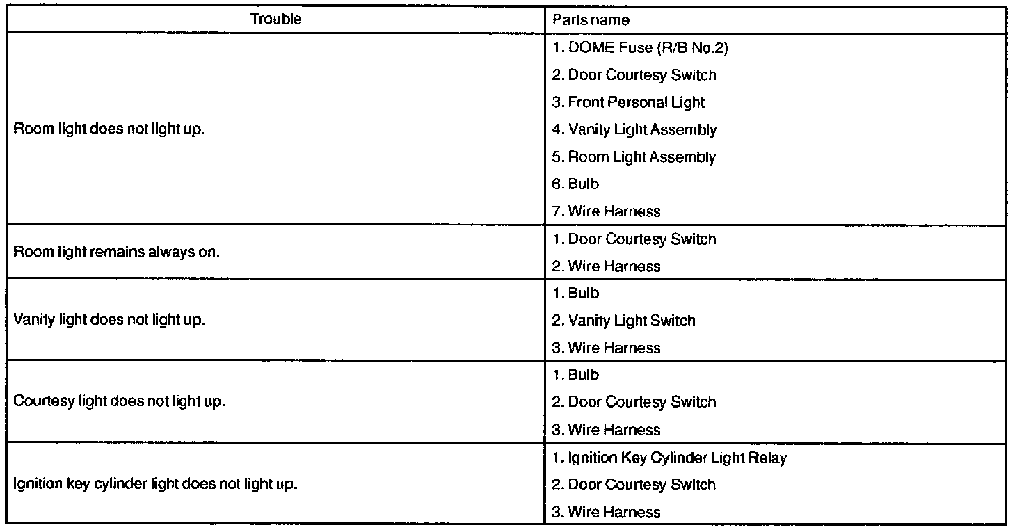 The table above will be useful for you in troubleshooting these electrical problems. The most likely causes of the malfunction are shown in the order of their probability. Inspect each part in the order shown, and replace the part when it is found to be faulty.