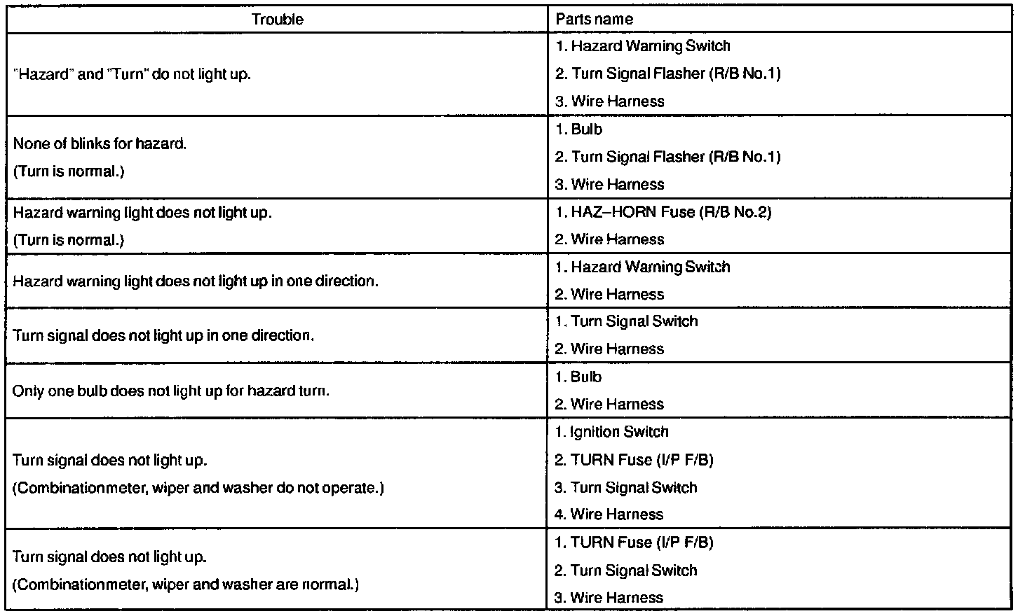 The table above will be useful for you in troubleshooting these electrical problems. The most likely causes of the malfunction are shown in the order of their probability. Inspect each part in the order shown, and replace the part when it is found to be faulty.