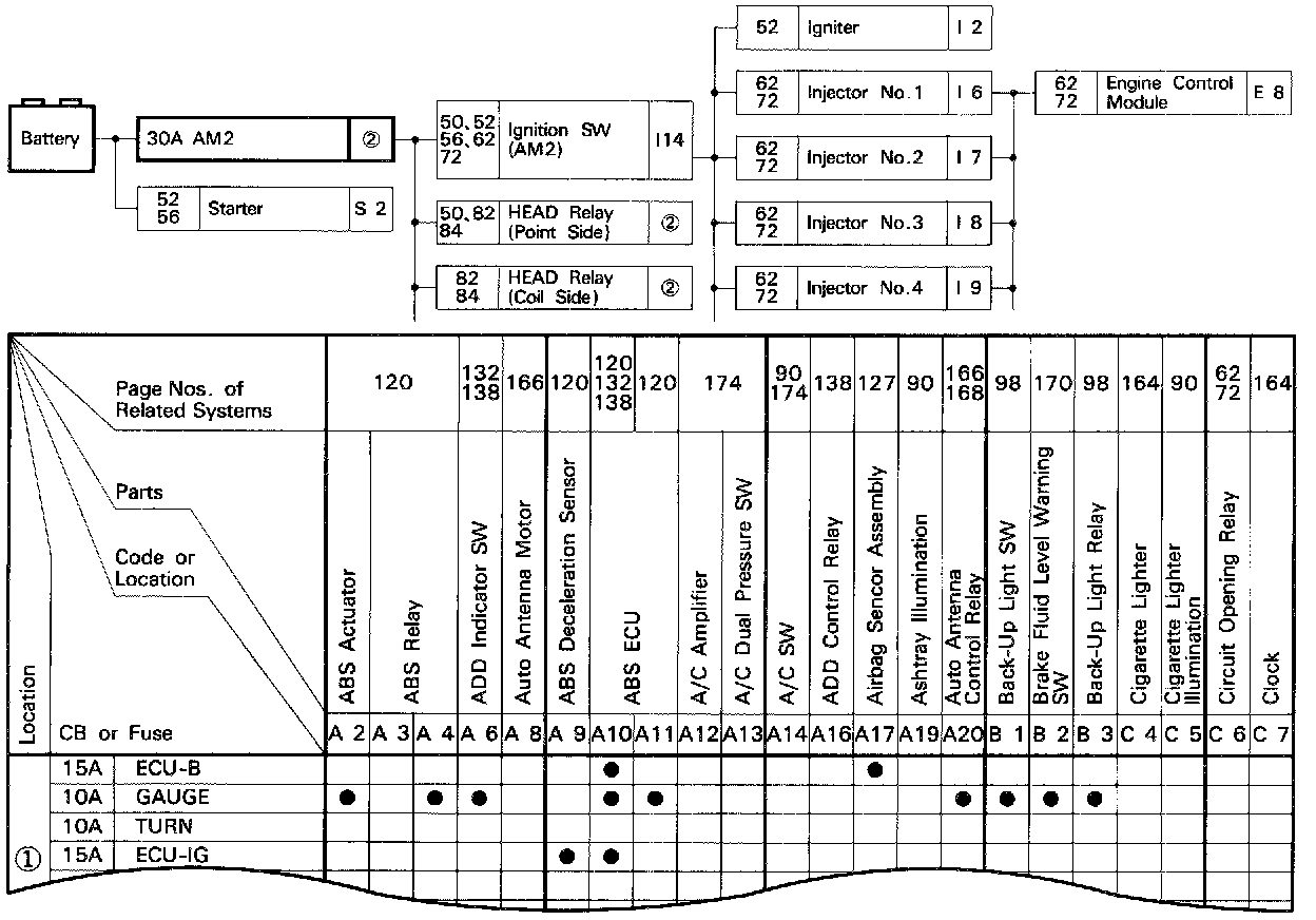 The chart below shows the route by which current flows from the battery to each electric source (Fusible Link, Circuit Breaker, Fuse, etc.) and other parts.