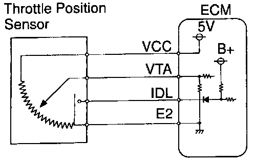 When the throttle valve is fully closed, the IDL contacts in the throttle position sensor are on, so the voltage at the terminal IDL of the ECM becomes 0V. At this time, a voltage of approximately 0.3 ~ 0.8V is applied to terminal VTA of the ECM. When the throttle valve is opened, the IDL contacts go off and thus the power source voltage of approximately 12 V in the ECM is applied to the terminal IDL of the ECM. The voltage applied to the terminals VTA of the ECM increases in proportion to the opening angle of the throttle valve and becomes approximately 3.2 ~ 4.9V when the throttle valve is fully opened. The ECM judges the vehicle driving conditions from these signals input from terminals VTA and IDL, uses them as one of the conditions for deciding the air-fuel ratio correction, power increase correction and fuel-out control etc.