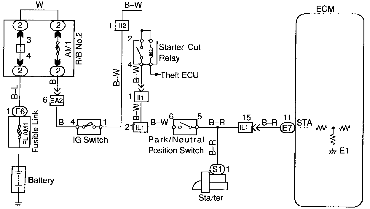 CIRCUIT DESCRIPTIONWhen the engine is cranked, the intake air flow is slow, so fuel vaporization is poor. A rich mixture is therefore necessary in order to achieve good startability. While the engine is being cranked, the battery positive voltage is applied to terminal STA of the ECM. The starter signal id mainly used to increase the fuel injection volume for the starting injection control and after-start injection control.