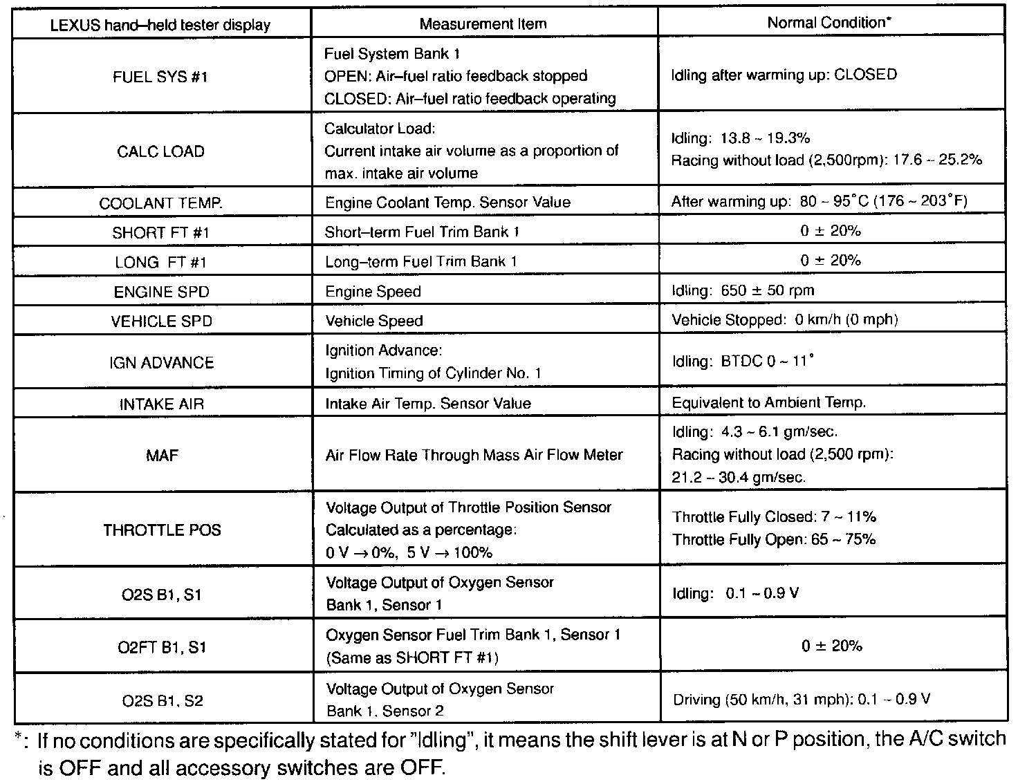 NOTICE: The values given below for "Normal Condition" are representative values, so a vehicle may still be normal even if its value from those listed here. So do not decide whether a part is faulty or not solely according to the "Normal Condition" here.(a) CARB mandated signals.