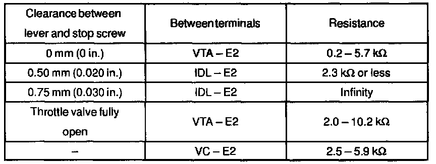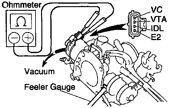 (b) Insert a 0.50 mm (0.020 in.) or 0.75 mm (0.030 in.) feeler gauge between the throttle stop screw and stop lever.