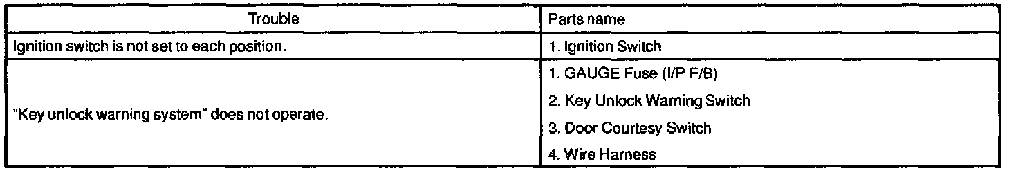The table above will be useful for you in troubleshooting these electrical problems. The most likely causes of the malfunction are shown in the order of their probability. Inspect each part in the order shown, and replace the part when it is found to be faulty.