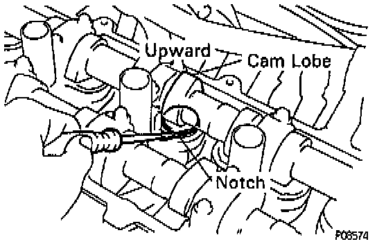 ^ Turn the camshaft so that the cam lobe for the valve to be adjusted faces up.