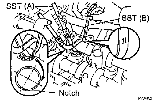 ^ Using SST Valve Clearance Adjust Tool Set # 09248 - 55050 or (A) (Valve Lifter Press # 09248 - 05510), press down the valve lifter and remove SST (B) Valve Lifter Stopper # 09248 - 06020 or equivalents.