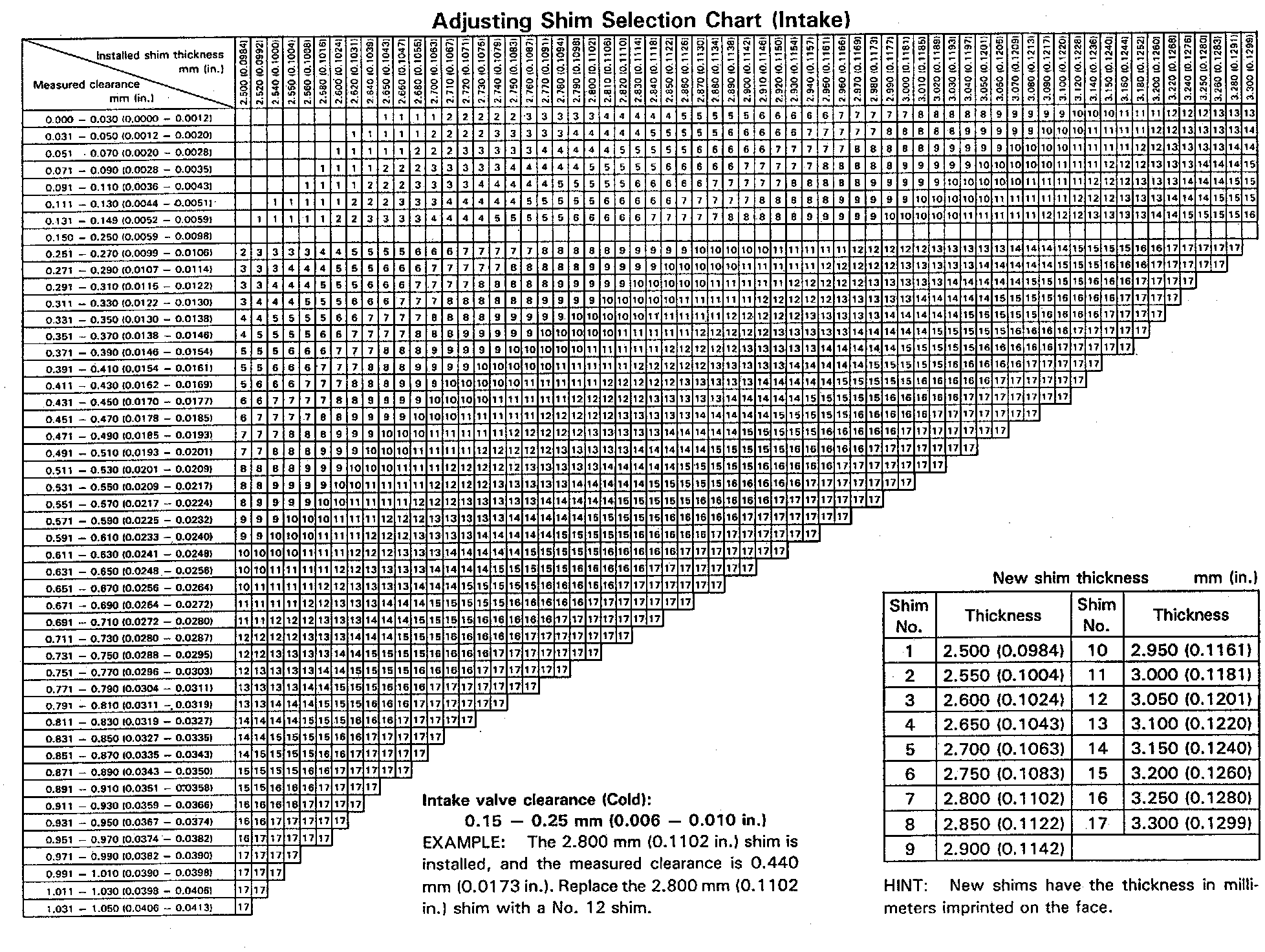 Adjusting Shim Selection Chart (Intake):