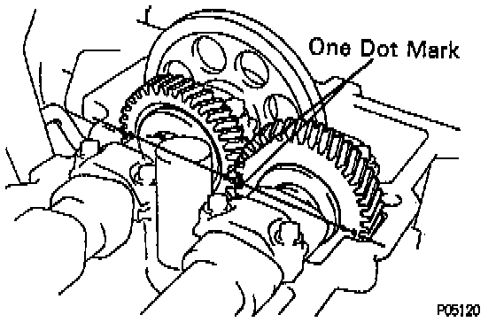 (b) Check that the timing marks (one and two dots) of the camshaft drive and driven gears are in straight line on the cylinder head surface as shown in the illustration.