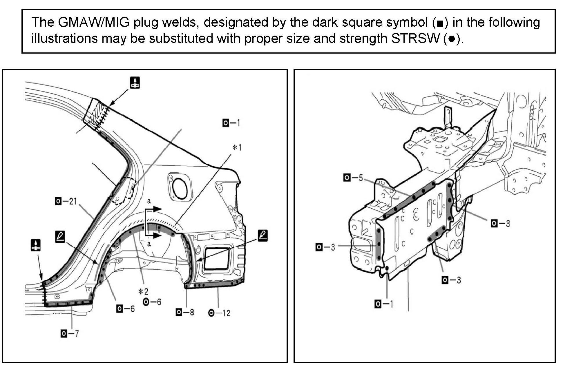 The following illustrations are examples of body component welding specifications that call-out the locations of GMAW/MIG welds that may be substituted with STRSW. For model-specific instructions specifications and reference charts review the applicable Collision Damage Repair Manual.
