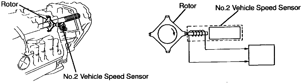 The No.2 vehicle speed sensor detects the rotation speed of the transmission output shaft and sends signal to the ECM. The ECM determines the vehicle speed based on these signals.