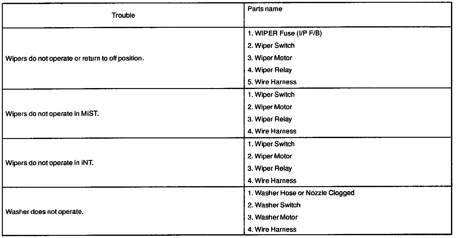 The table above will be useful for you in troubleshooting these electrical problems. The most likely causes of the malfunction are shown in the order of their probability. Inspect each part in the order shown, and replace the part when it is found to be faulty.