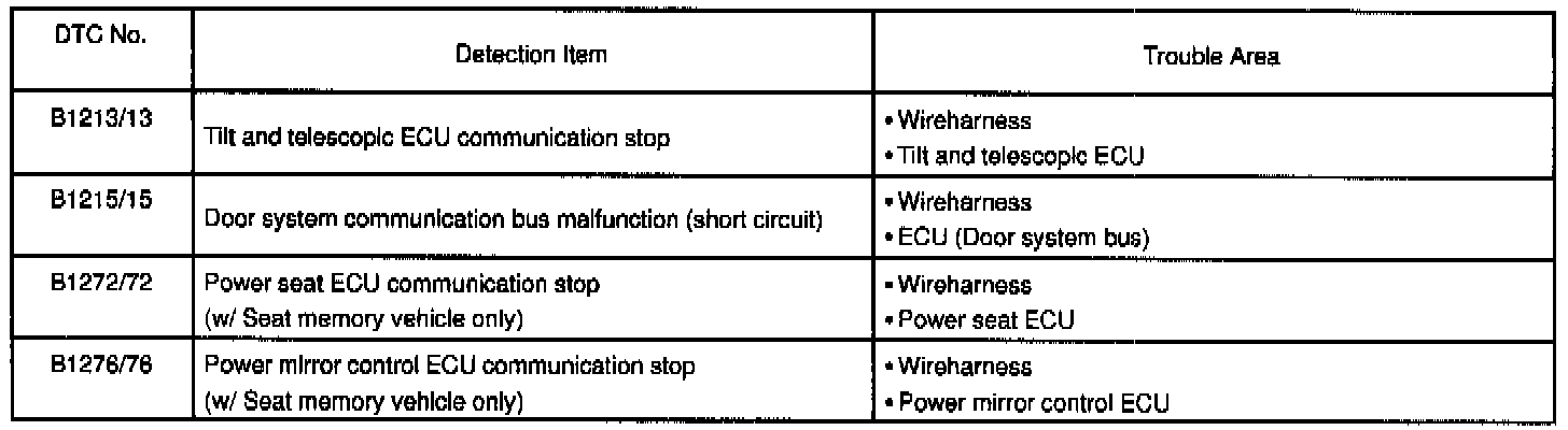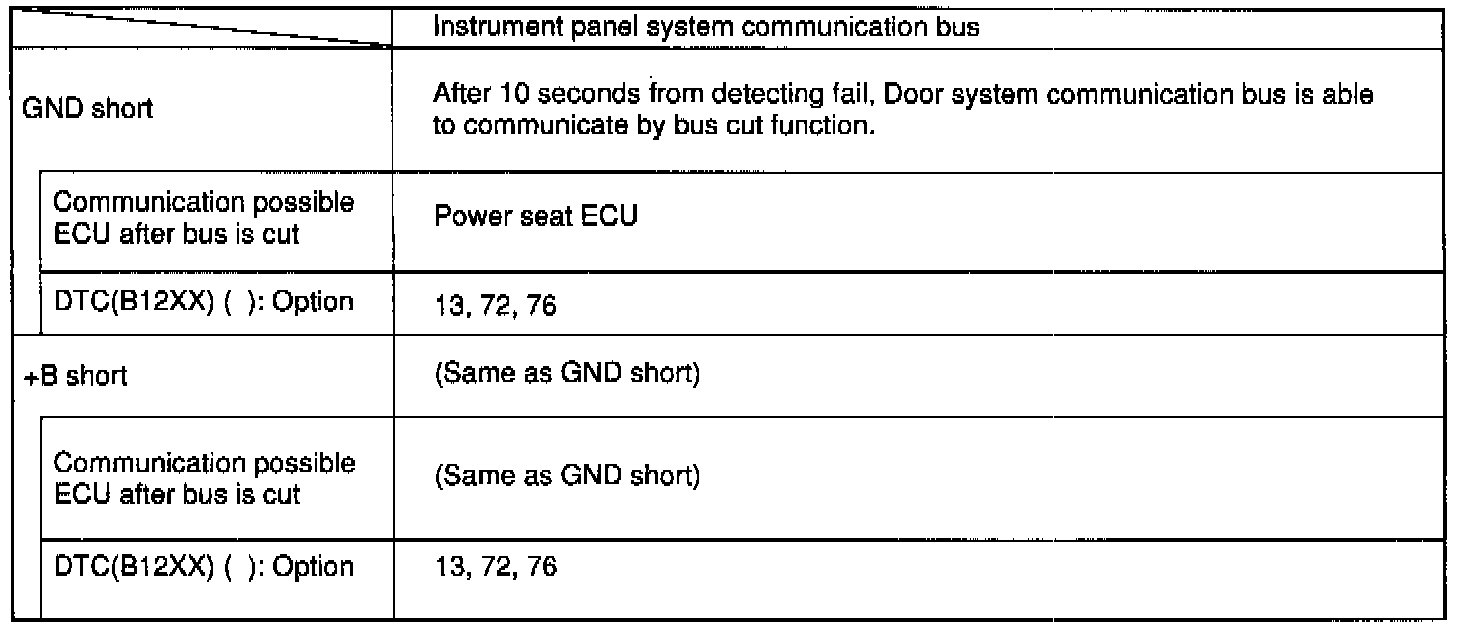 HINT: When some of the DTC 15 is output, the DTC of other ECU communication stop is also output. In this case, please repair DTC 15 first. The chart above shows DTCs which are output when +B or GND short occurs on communication bus.