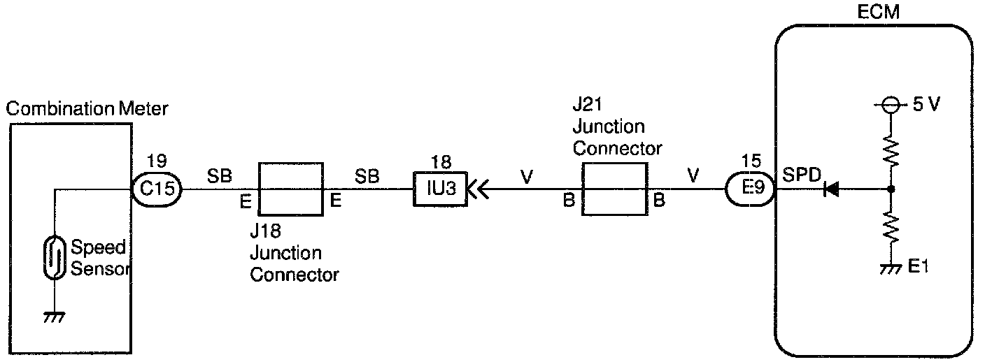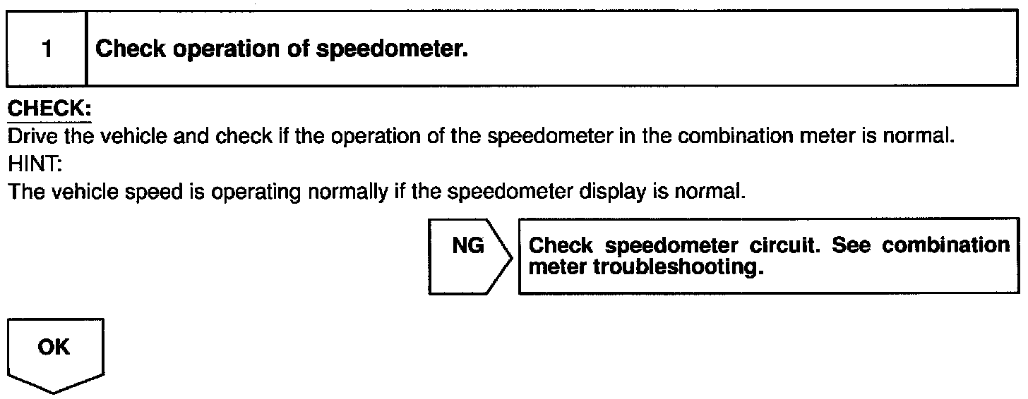 The No.1 vehicle speed sensor outputs a 4-pulse signal for every revolution of the rotor shaft, which is rotated by the transmission output shaft via the driving gear. After this signal is converted into a more precise rectangular waveform by the waveform shaping circuit inside the combination meter, it is then transmitted to the ECM. The ECM determines the vehicle speed based on the frequency of these pulse signals.