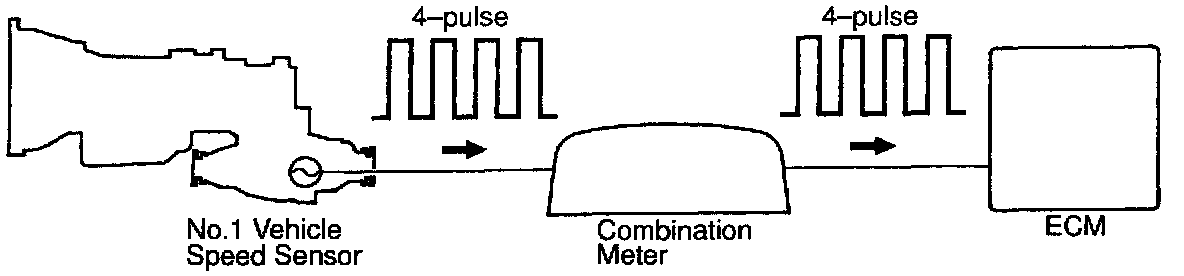 The vehicle speed sensor outputs a 4-pulse signal for every revolution of the rotor shaft, which is rotated by the transmission output shaft via the driven gear. After this signal is converted into a more precise rectangular waveform by the waveform shaping circuit inside the combination meter, it is then transmitted to the ECM. The ECM determines the vehicle speed based on the frequency of these pulse signals.