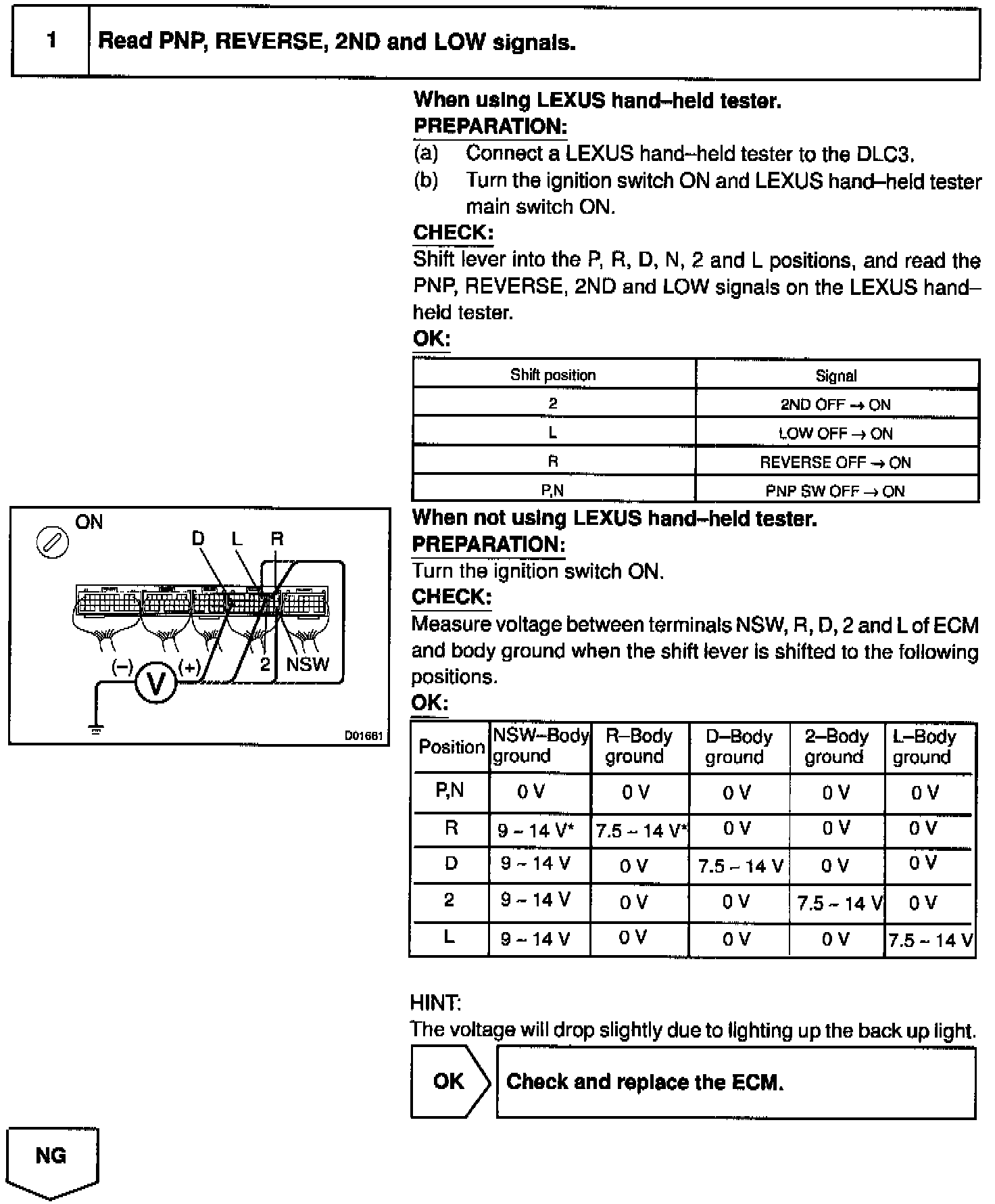 HINT: After confirming DTC P1780 use the LEXUS hand-held tester to confirm the PNP switch signal from CURRENT DATA.