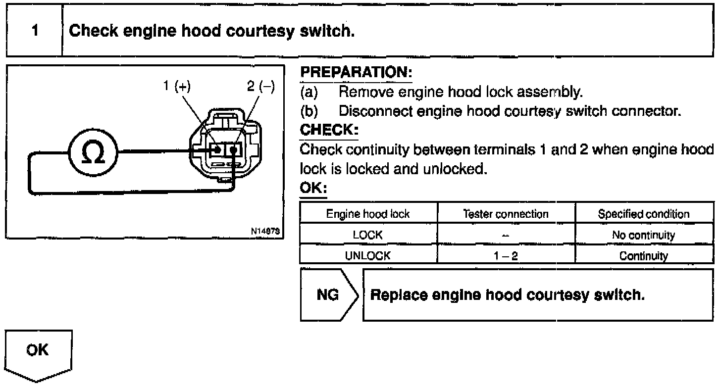 The engine hood courtesy switch is built into the engine hood lock assembly and goes ON when the engine hood is opened and goes OFF when the engine hood is closed.