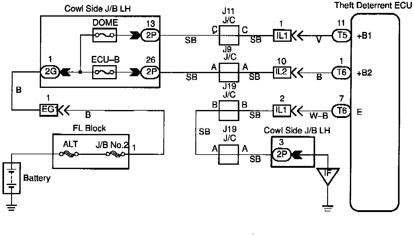 This circuit provides power to operate the theft deterrent ECU.