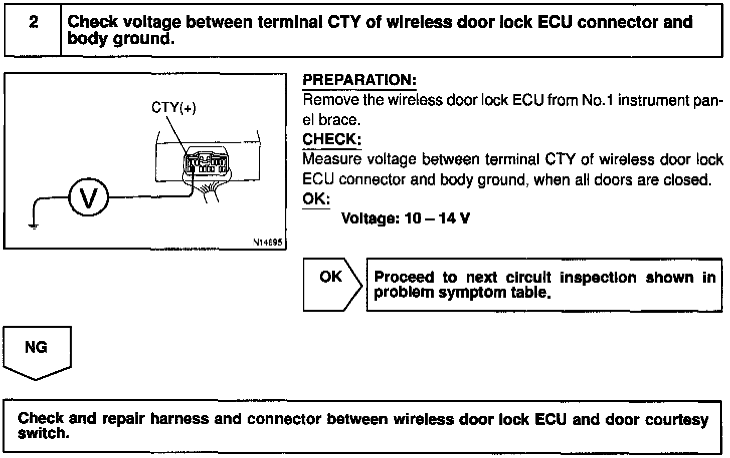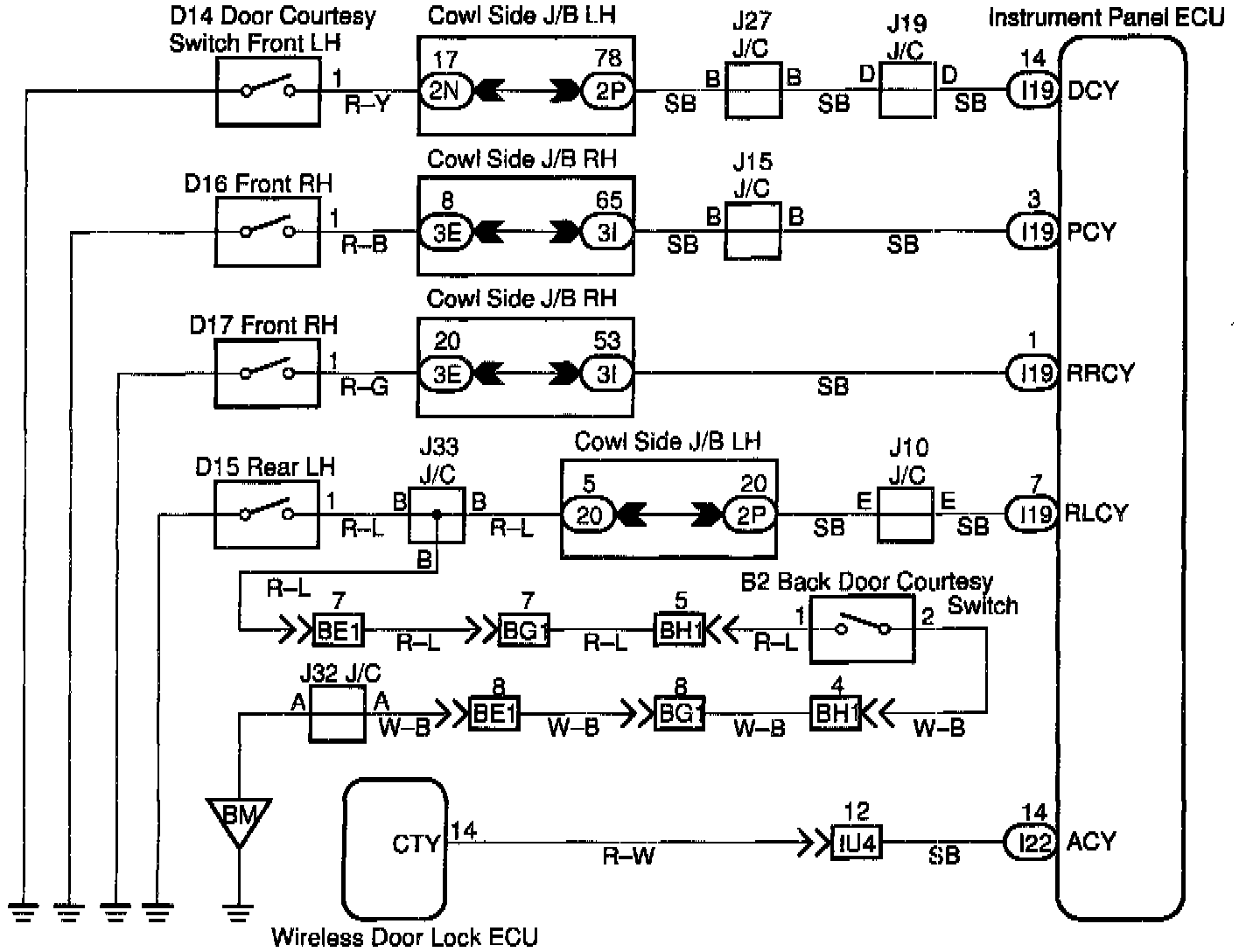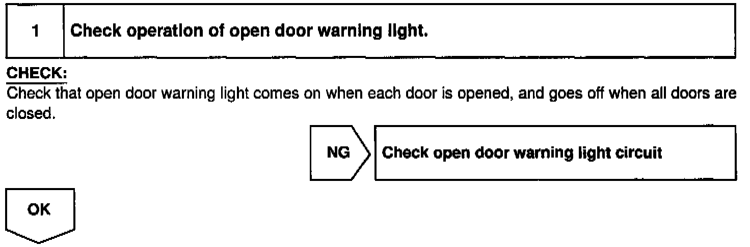 The door courtesy switch comes ON when the door is opened and goes OFF when door is closed. Furthermore. the door courtesy switch circuit has terminal +B connected inside the theft deterrent ECU. Battery positive voltage is applied to terminal DSWD of the theft deterrent ECU when all doors are closed, i.e., when the door courtesy switches of all doors are OFF.